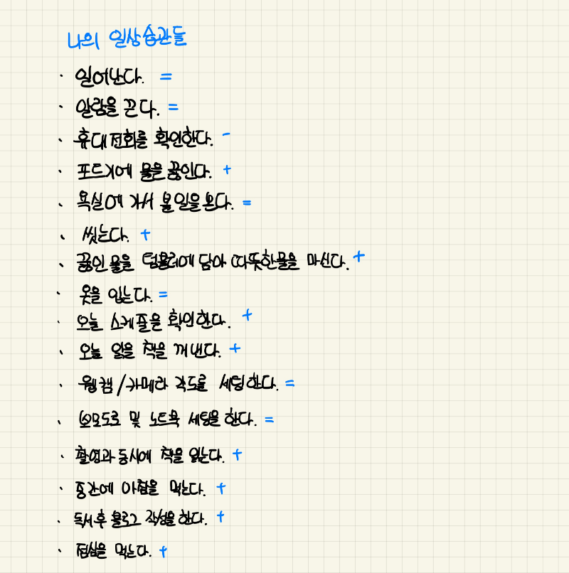 앞으로는 이처럼 의식적으로 시작해서 무의식으로 습관을 바꾸는 노하우를 더 익히고 싶다.